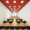 È la sala in cui si svolgono le udienze e i dibattiti aperti alle parti e al pubblico. Il pavimento in rovere, le pareti bianche e il soffitto fonoassorbente rosso danno un'impressione di lontananza e di vicinanza simultaneamente.